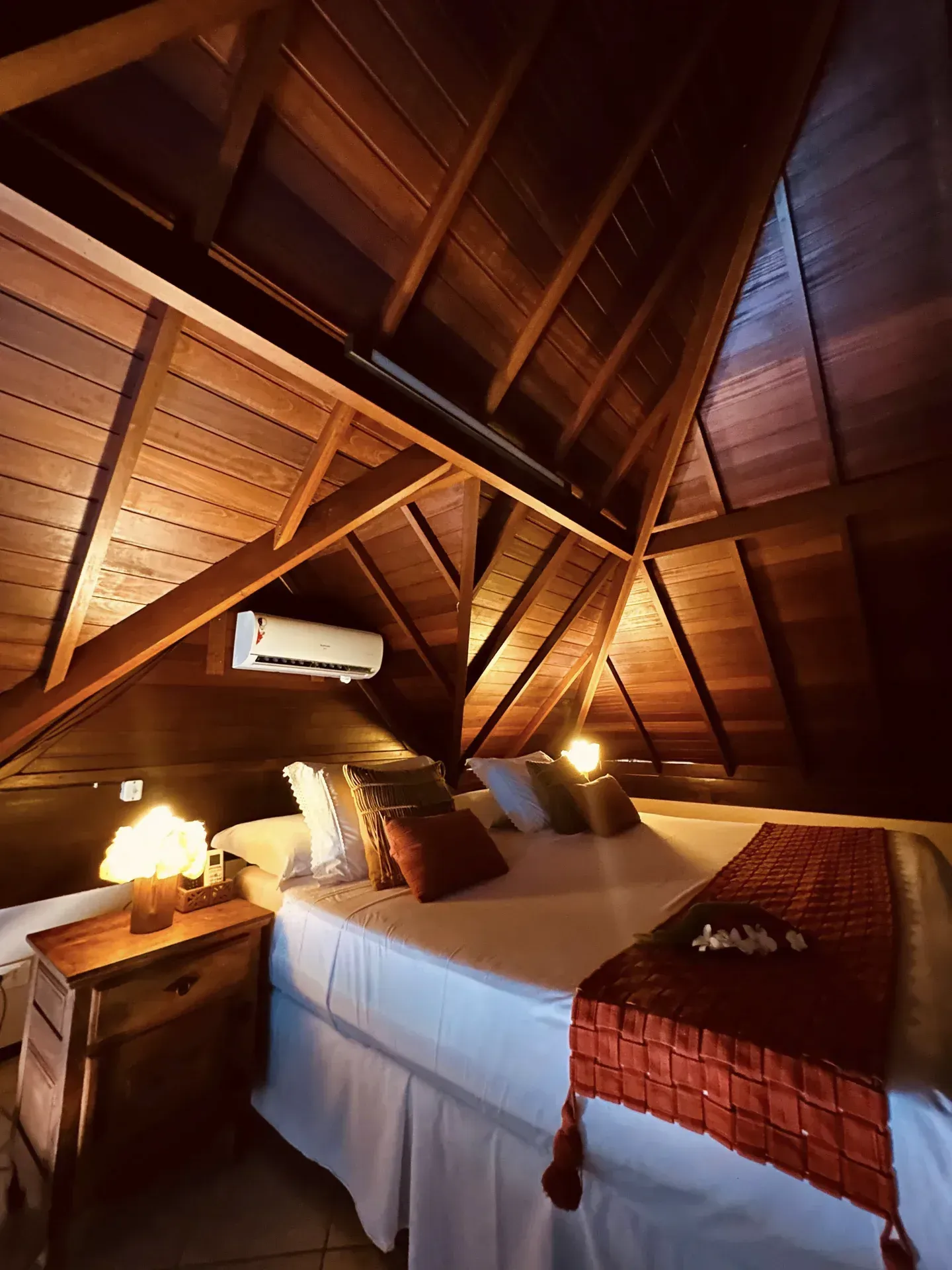 SUÍTE COM 02 AMBIENTES No andar superior da pousada com vista mar. – Ambiente Superior: 01 mezanino para casal com cama super king, ar-condicionado split, TV 32’ e frigobar; – Ambiente Inferior: 02 camas box solteiro, ar-condicionado split TV 32`, cofre, 01 banheiro com ducha quente e secador de cabelo.