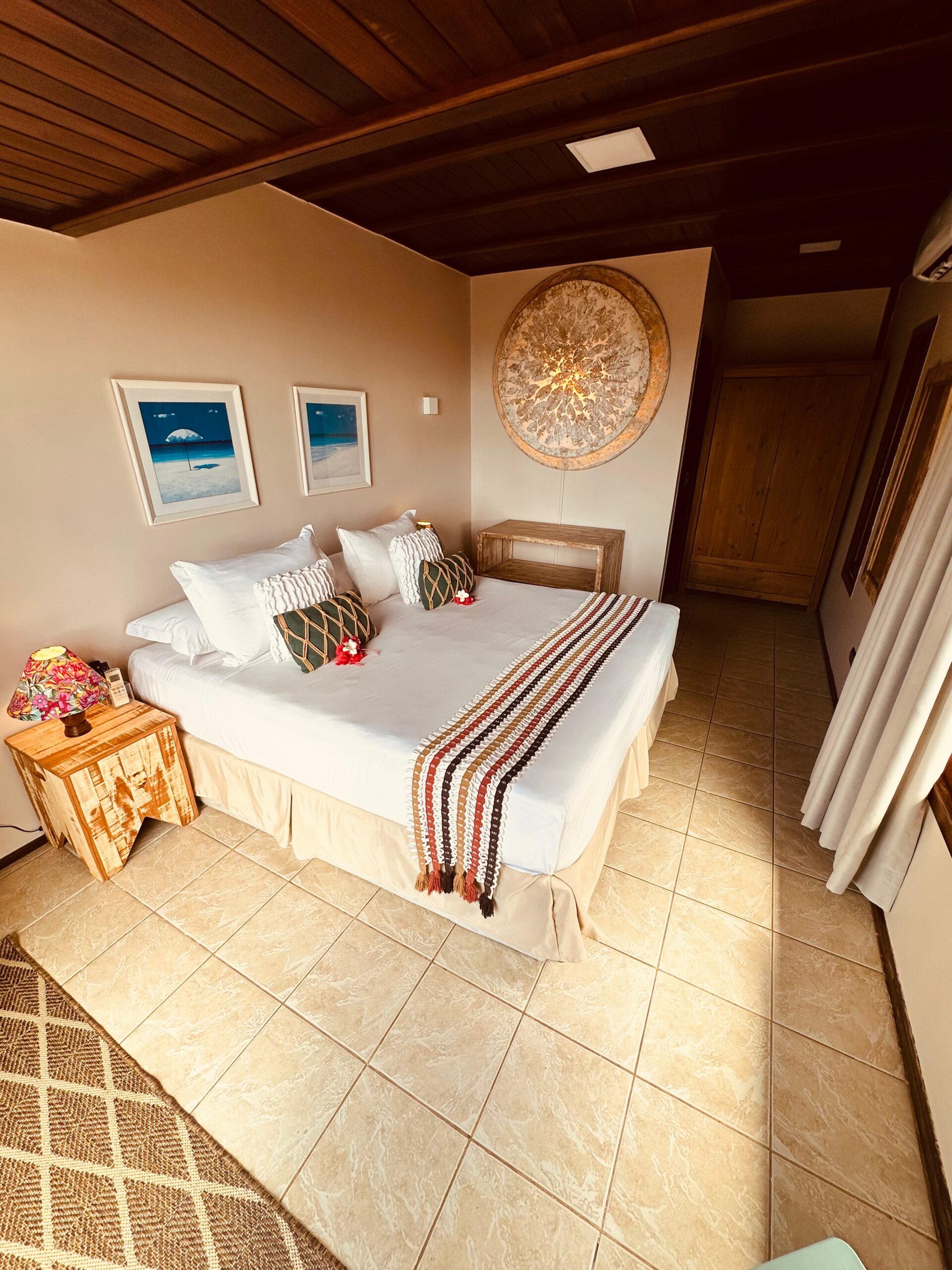 SUÍTE DE 1 AMBIENTE No andar superior da pousada com vista mar. - Ambiente: cama king size box, ar-condicionado split, TV 32', frigobar, cofre, banheiro com ducha quente e secador de cabelo.