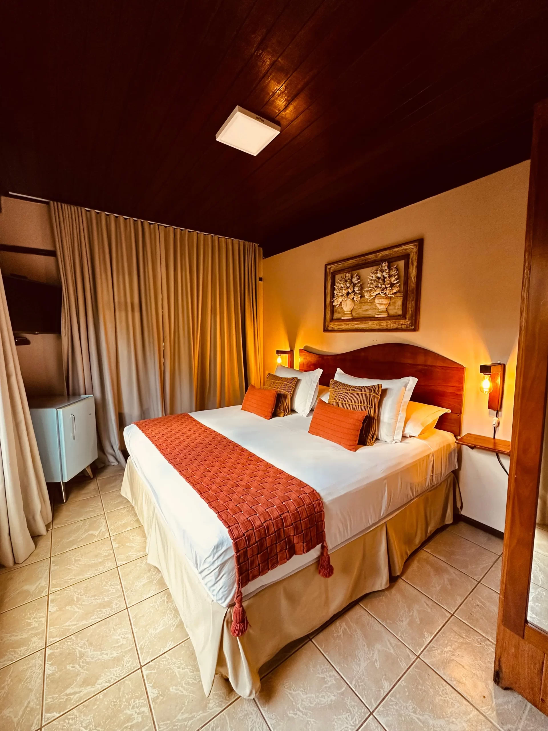SUÍTE DE 1 AMBIENTE No térreo da pousada (sem vista mar). - Ambiente: um pouco menor do que a suíte térrea luxo, com cama de casal box, ar-condicionado split, TV 32', frigobar, cofre, banheiro com ducha quente e secador de cabelo.