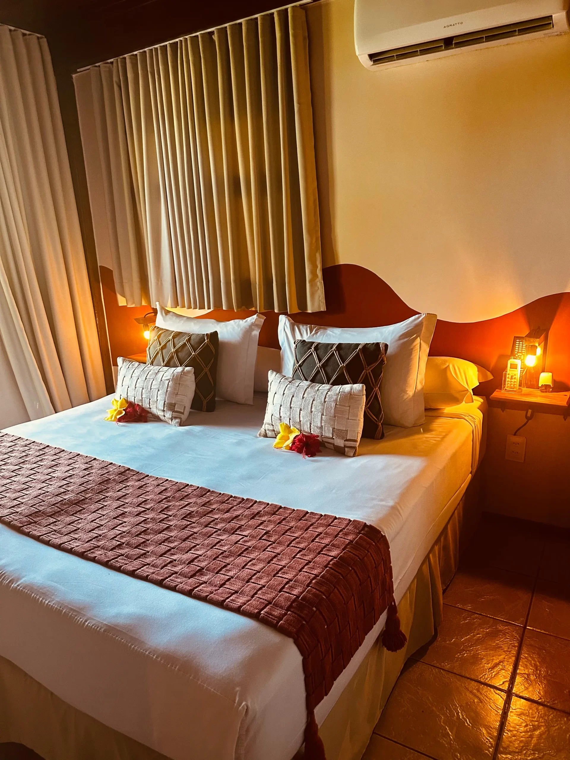 SUÍTE DE 1 AMBIENTE No térreo da pousada (sem vista mar). – Ambiente: um pouco menor do que a suíte térrea luxo, com cama de casal box, ar-condicionado split, TV 32′, frigobar, cofre, banheiro com ducha quente e secador de cabelo.