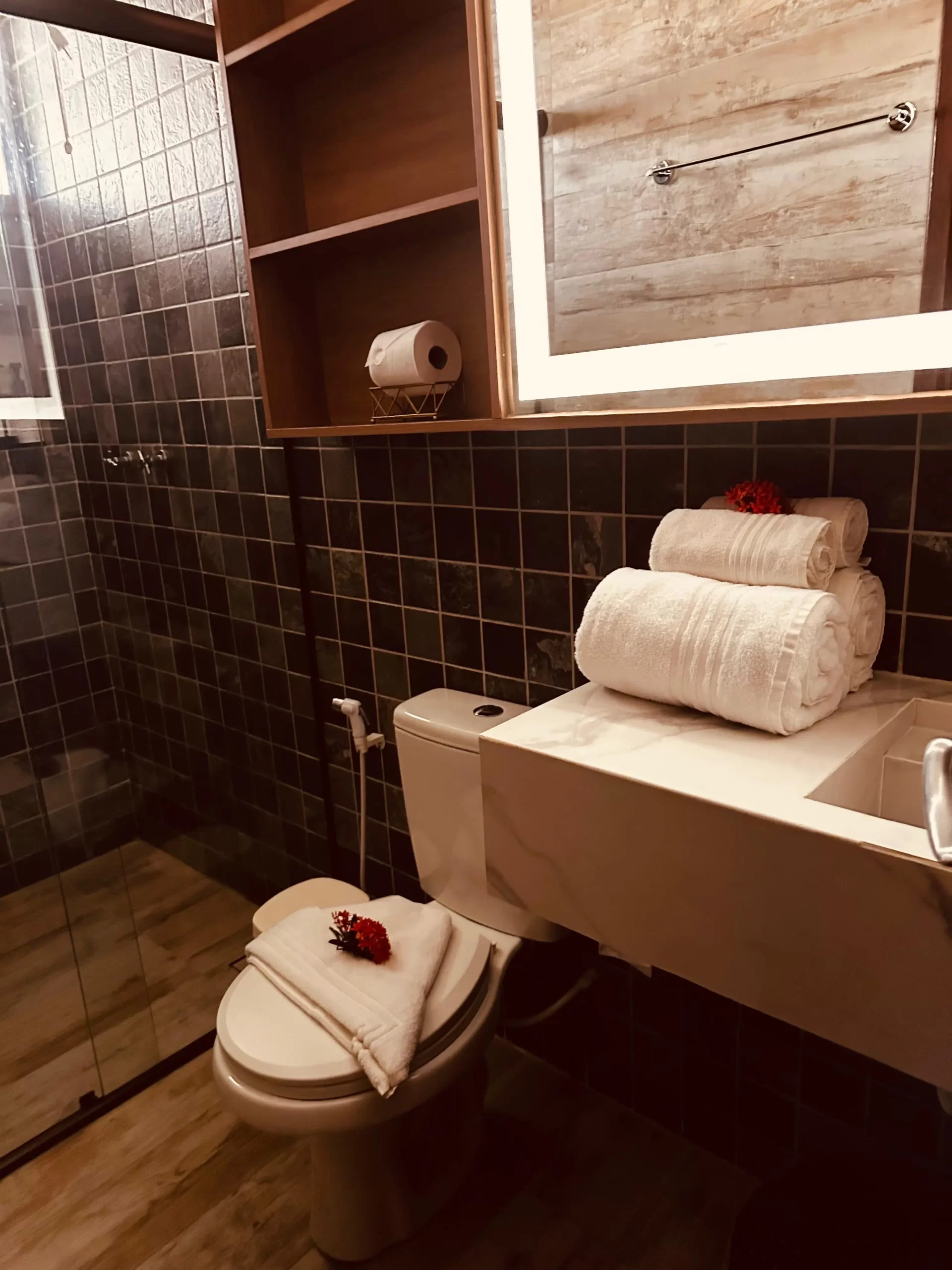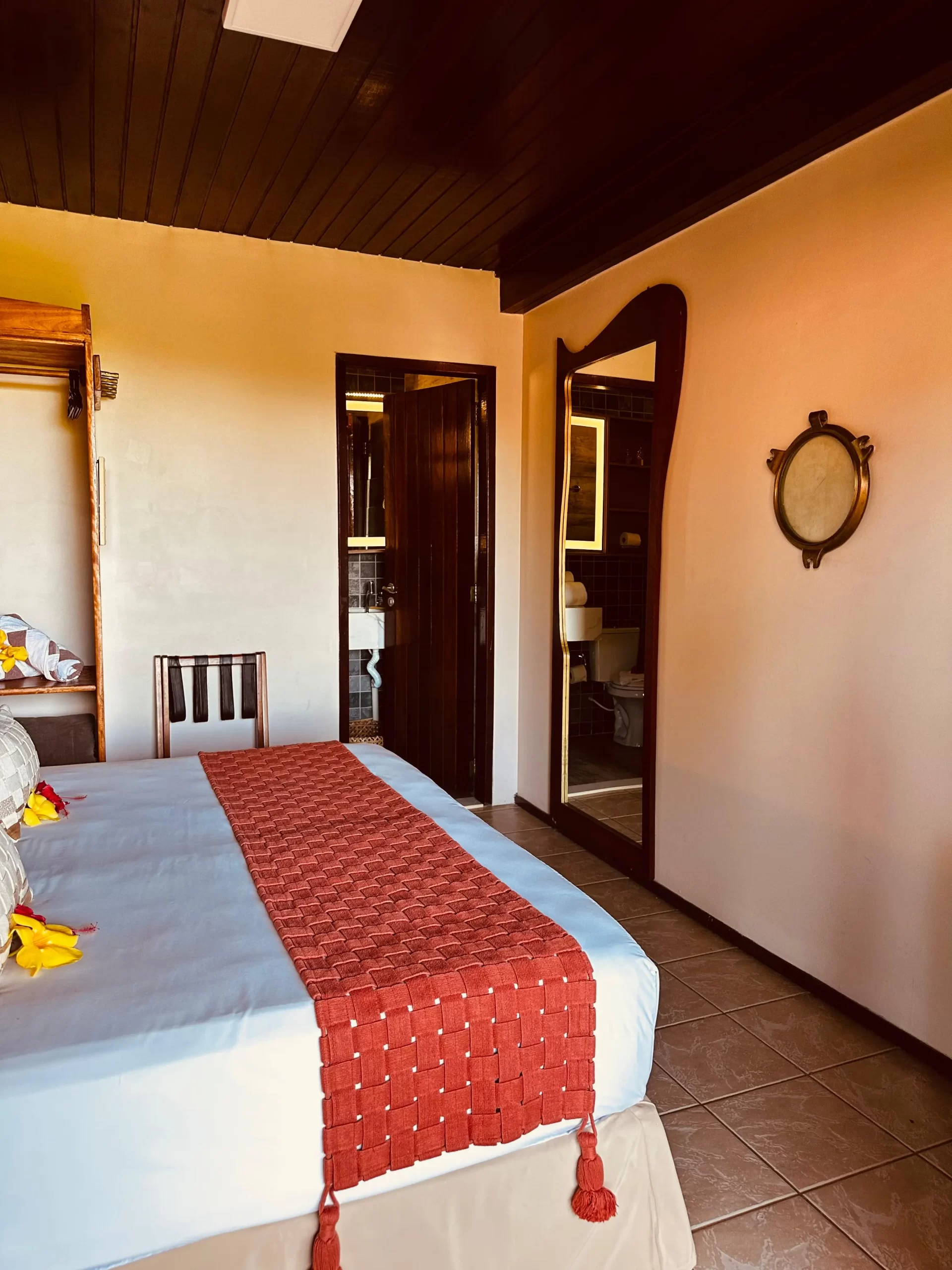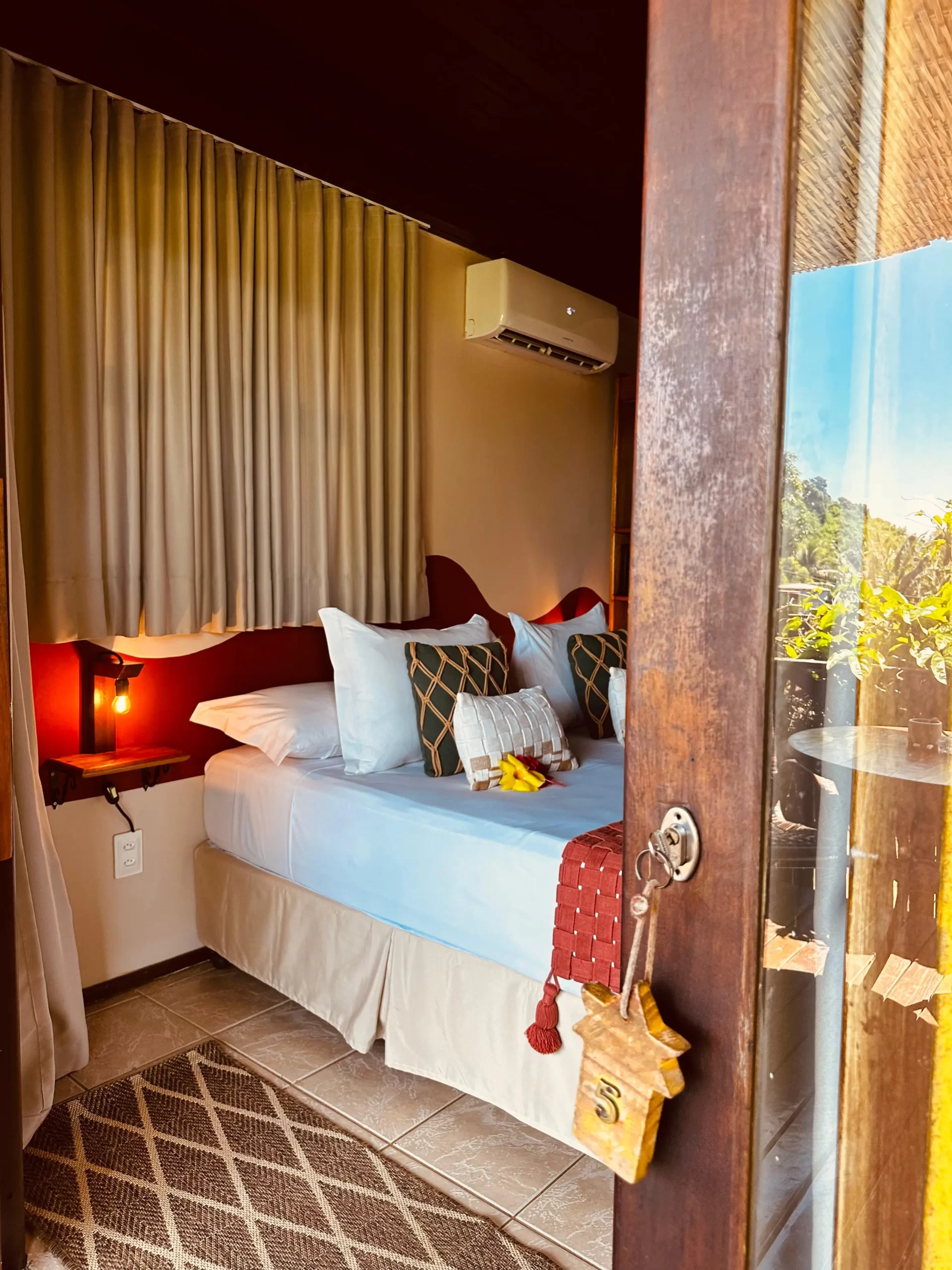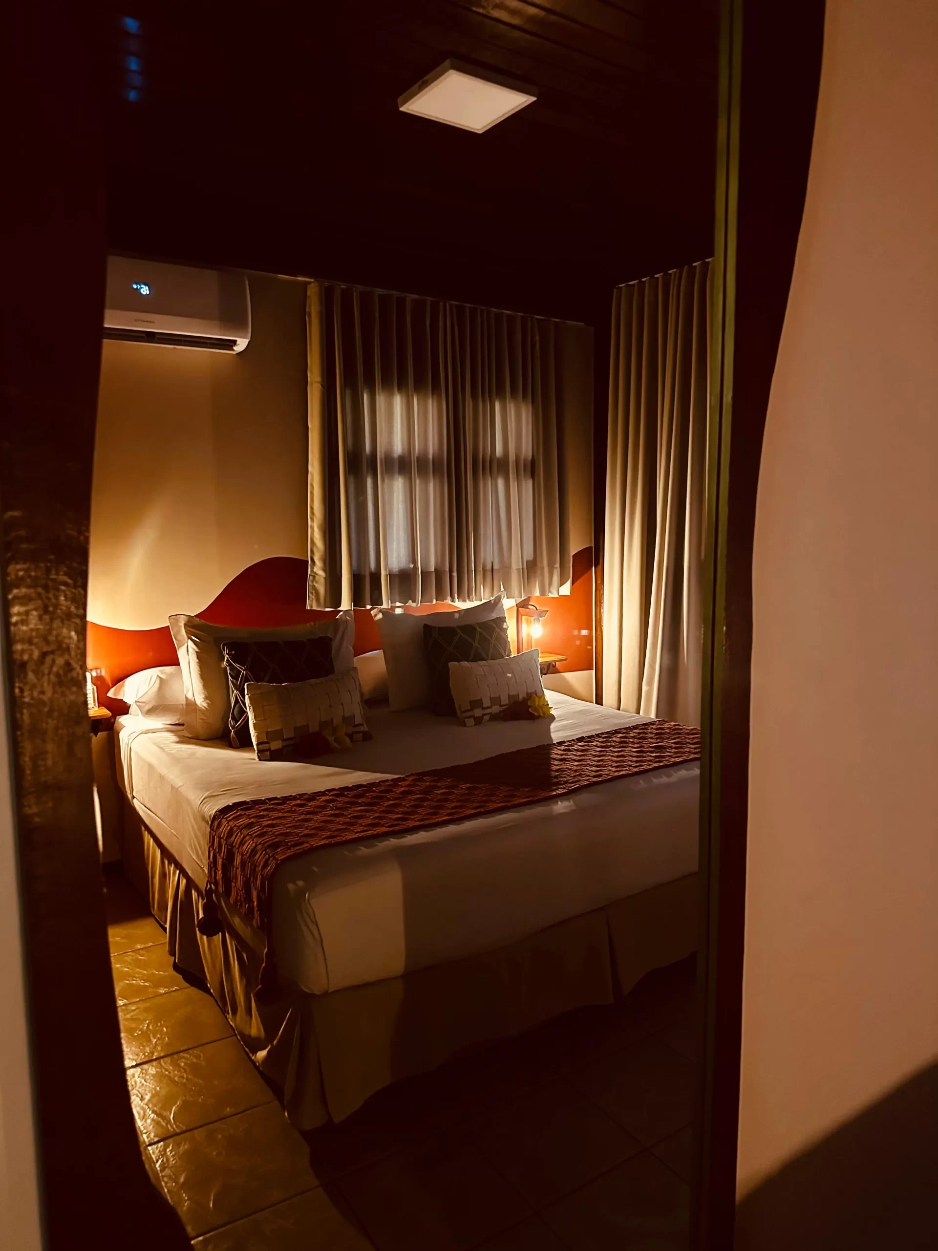 Esta suíte conta com uma cama queen size box, ar-condicionado, TV, frigobar, cofre, banheiro com ducha quente e secador de cabelo.