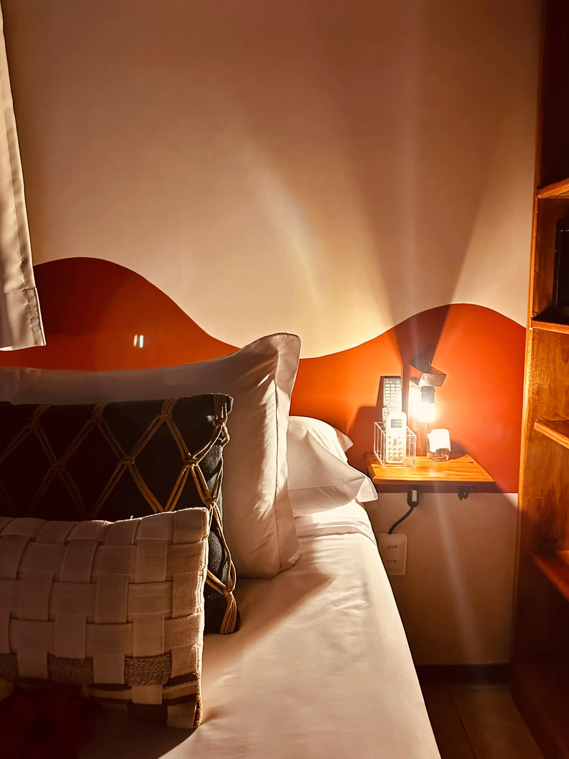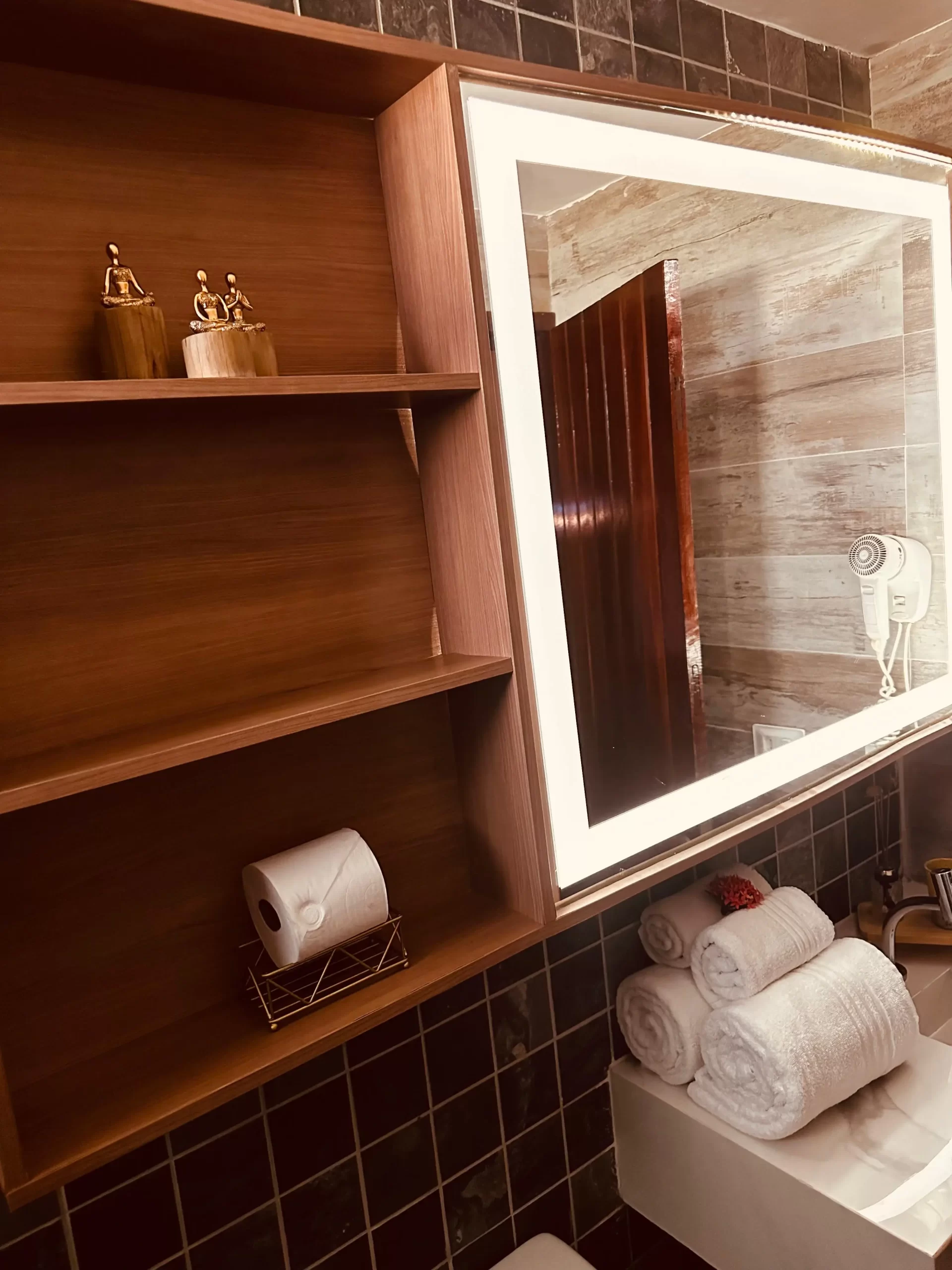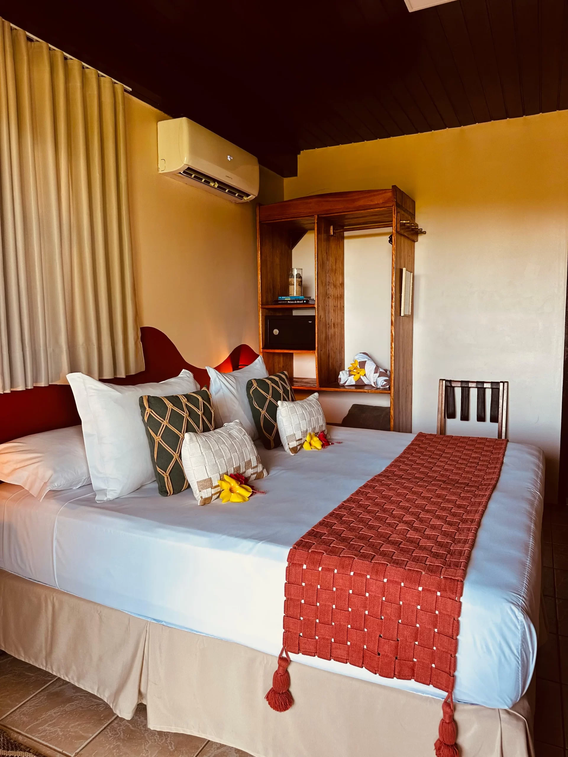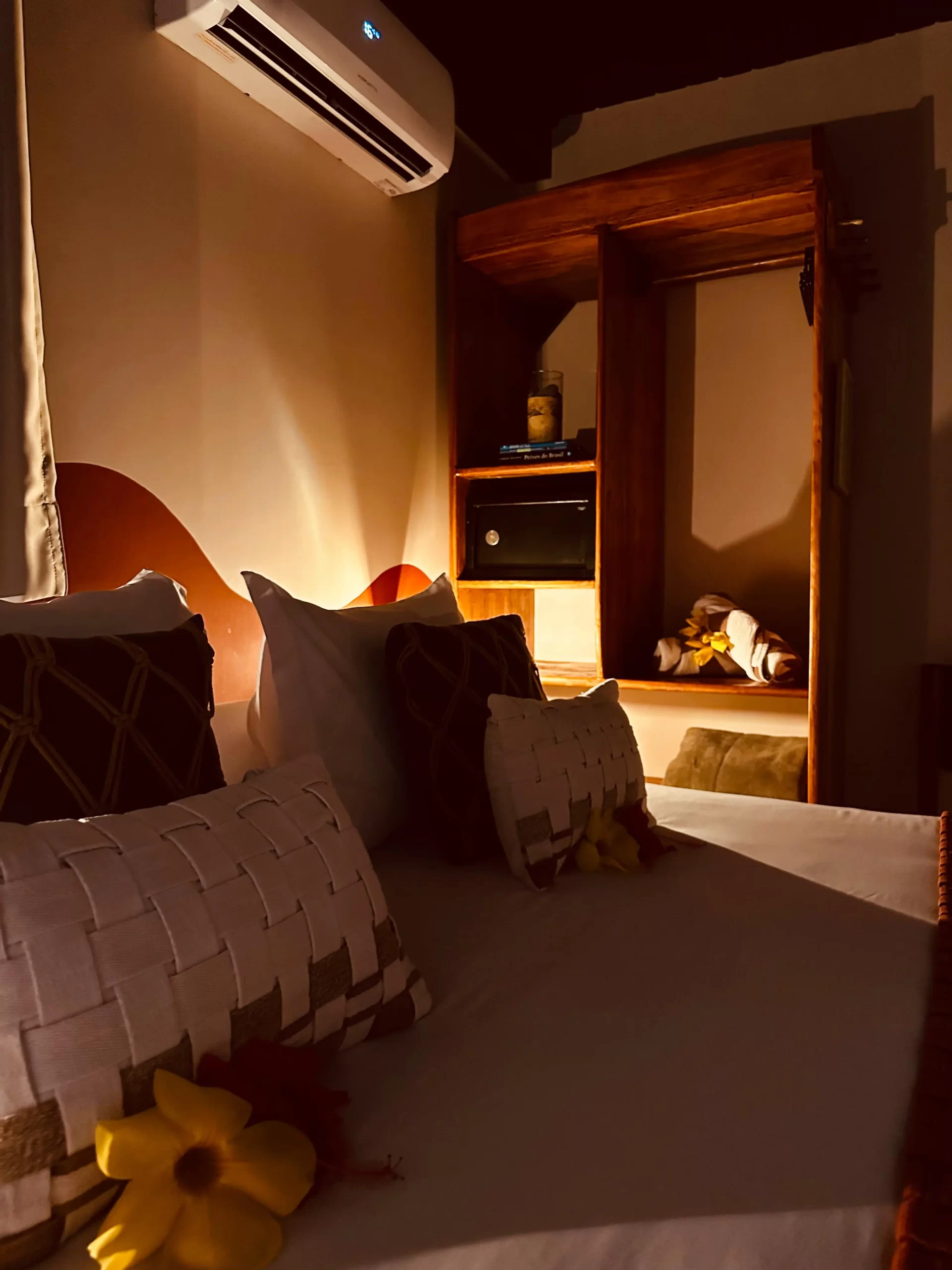 Esta suíte conta com uma cama queen size box, ar-condicionado, TV, frigobar, cofre, banheiro com ducha quente e secador de cabelo.
