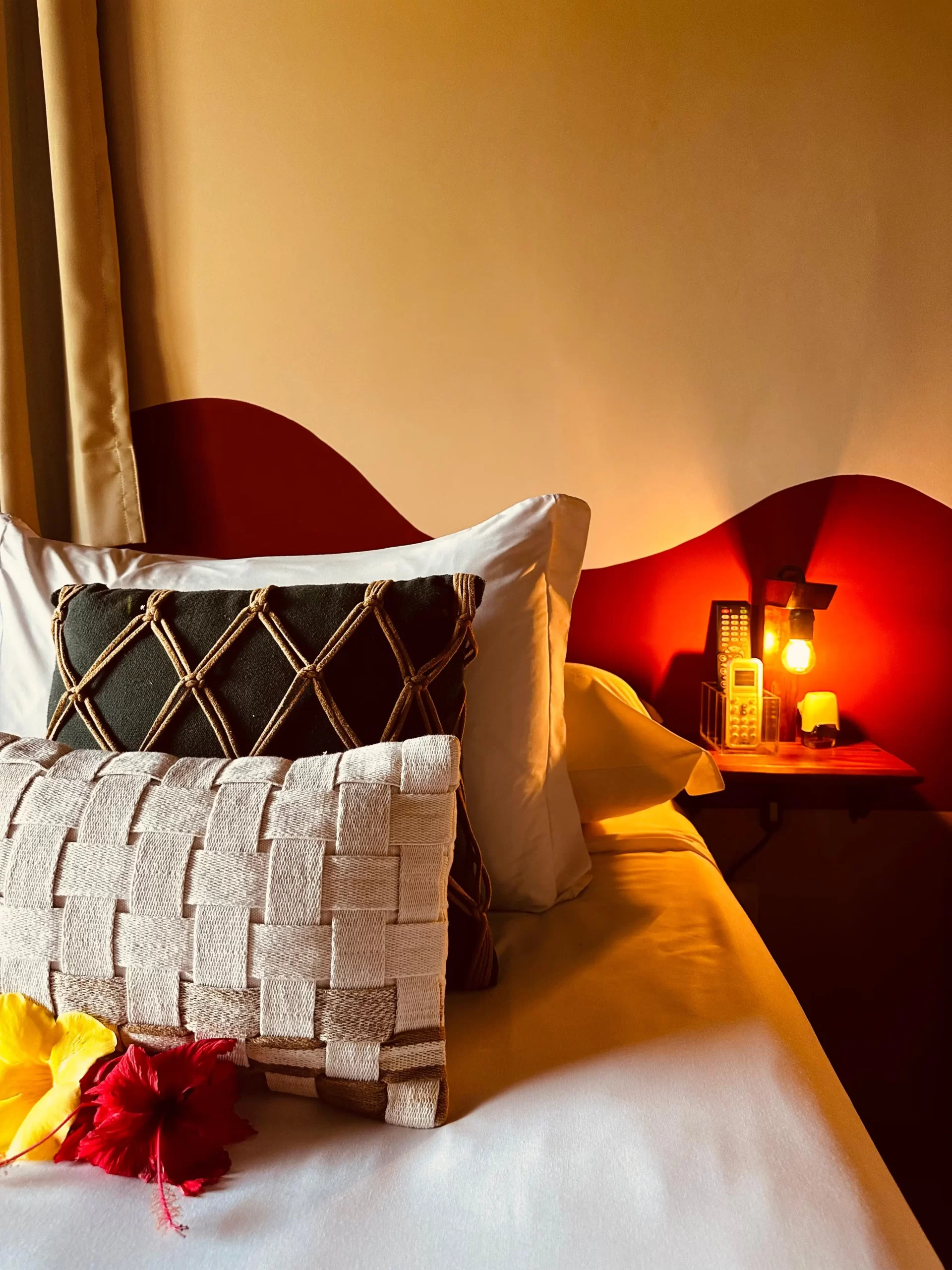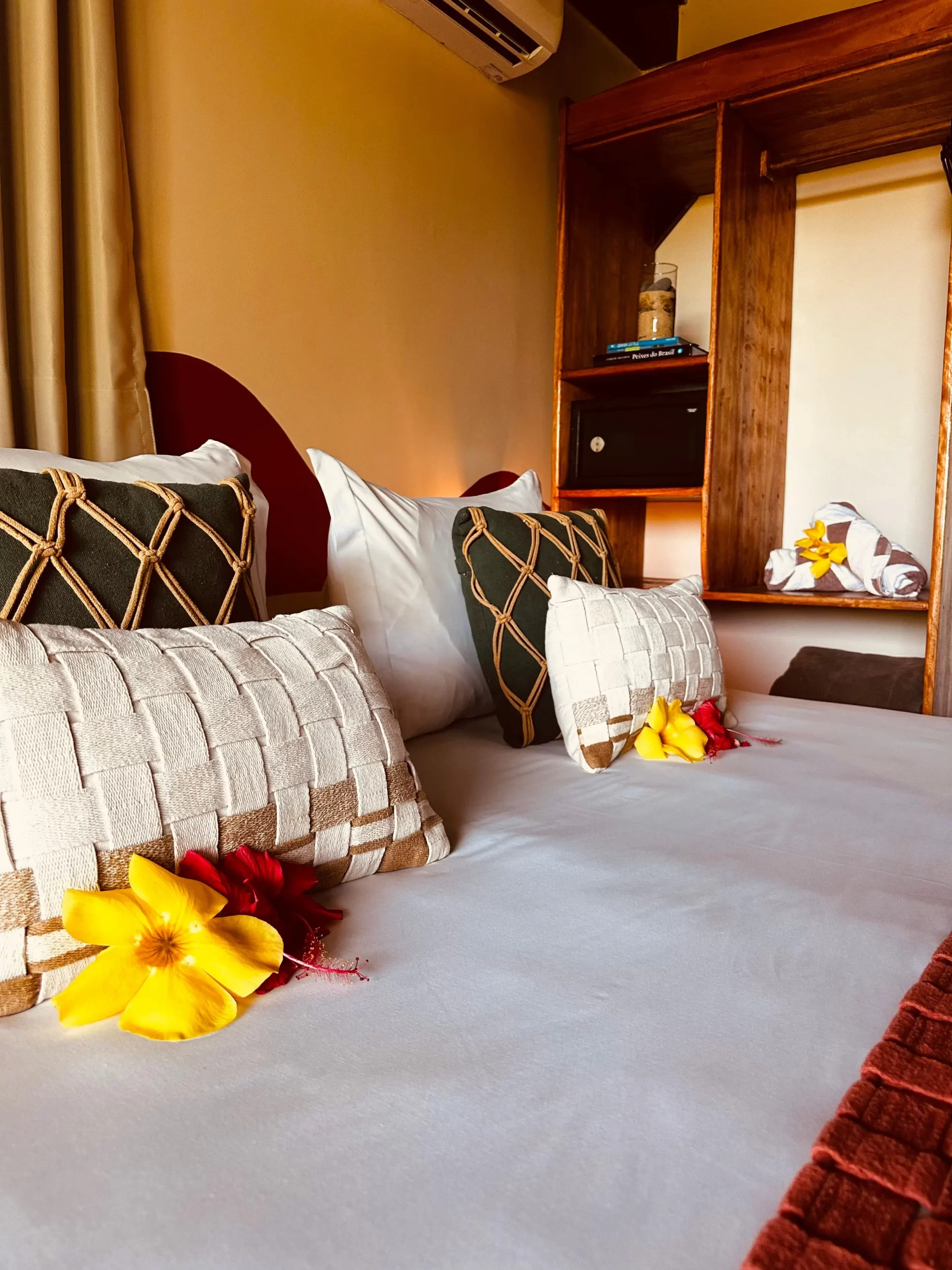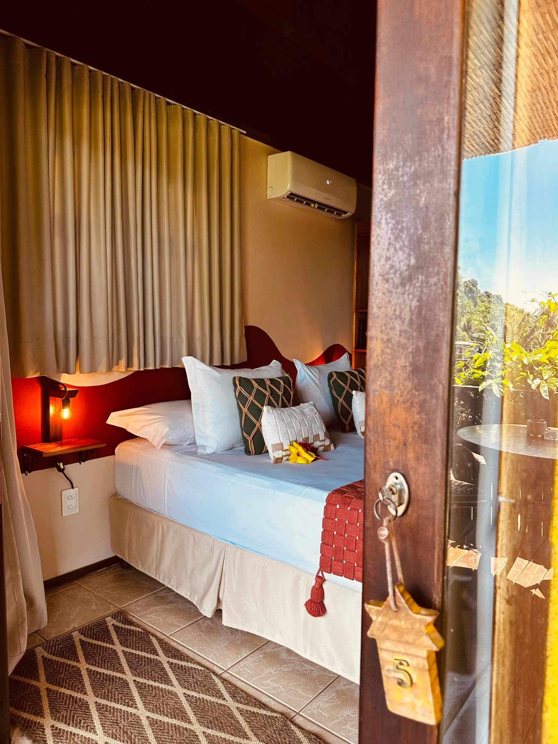 Suíte situada no andar térreo da pousada com ambiente externo decorado e arborizado.